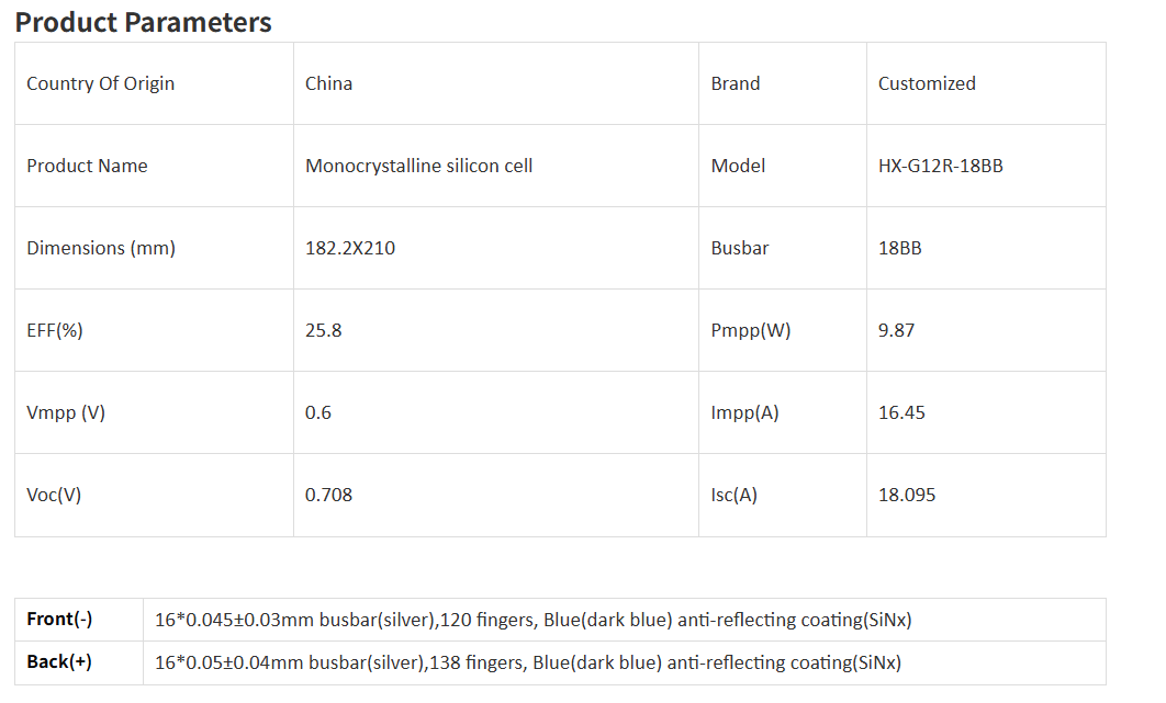 Our 182×210mm G12R bifacial monocrystalline solar cell delivers an impressive efficiency of up to 25.8% and a power output of 9.87W. Featuring advanced 18-busbar technology.