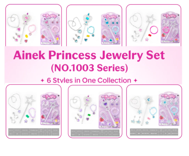 The Ainek Princess Jewelry Set (NO.1003 Series) includes six beautifully designed styles — each featuring sparkling tiaras, necklaces, bracelets, earrings, and magic wands in unique color combinations.