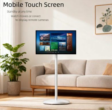 Portable smart touch display combining large-screen visual experience + Android smart system + mobile stand design, suitable for home entertainment, business presentation, education, and interactive use scenarios.